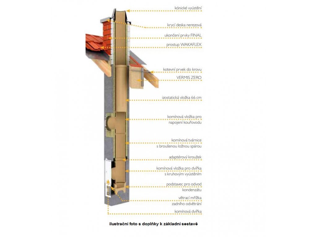 Komínová sestava obsahuje: komínové vložky, komínové tvárnice, maltová směs, komínová pata, komínová vložka pro kouřovod 90°, krycí deska nerezová pro zateplení, souprava komínové paty, izolační rohože.
