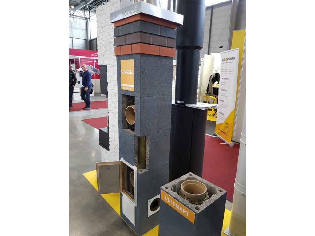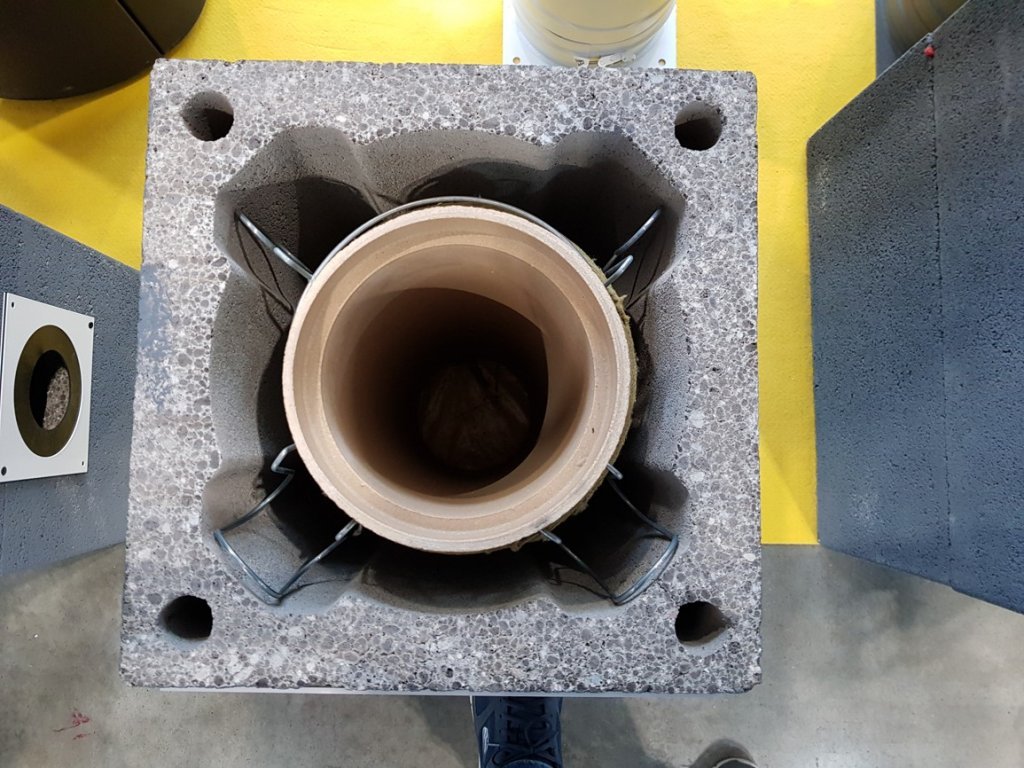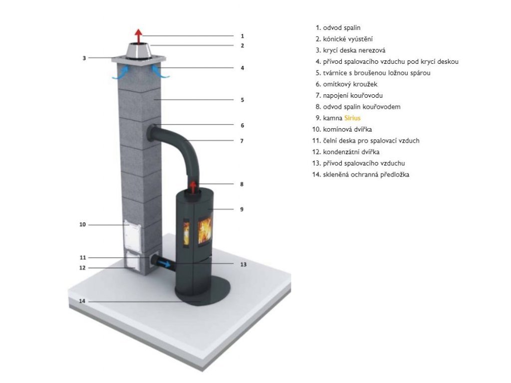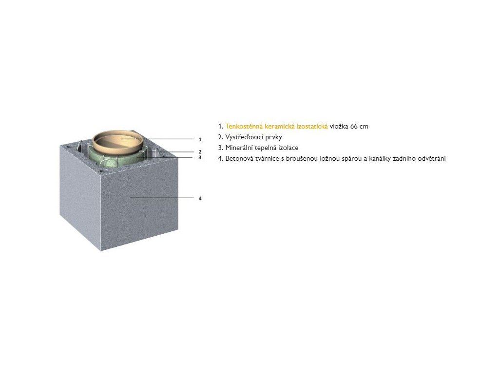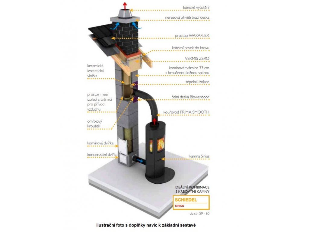 Komínová sestava obsahuje: komínové vložky, komínové tvárnice, betonový základ, maltová směs, komínová vložka pro dvířka, komínová vložka pro kouřovod 90°, krycí deska přivětrávací nerezová pro zateplení, izolační návleky, distanční prvky, spárovací hmota.