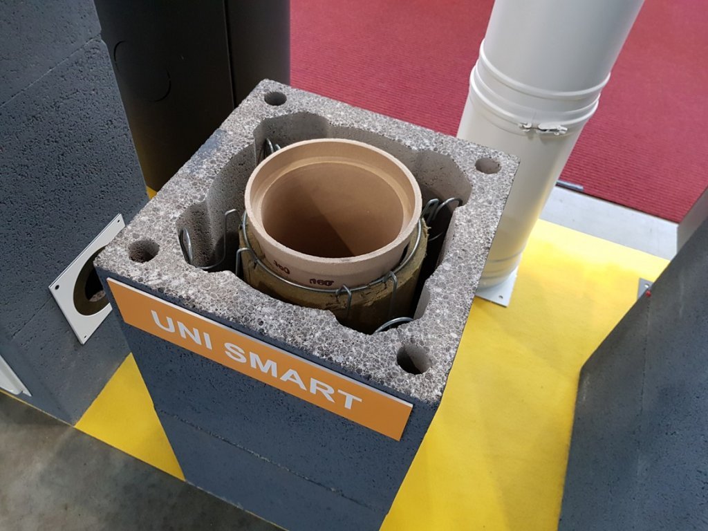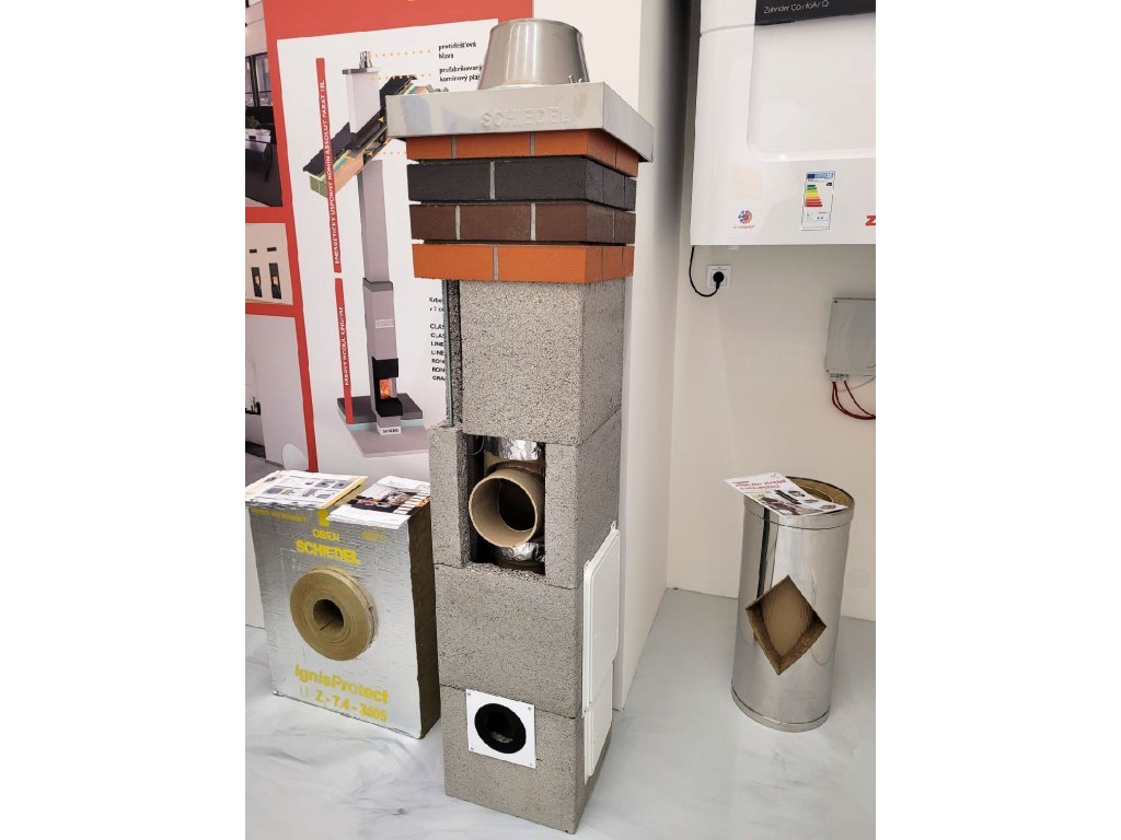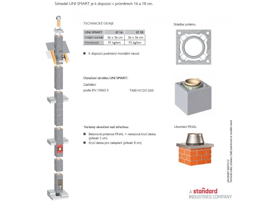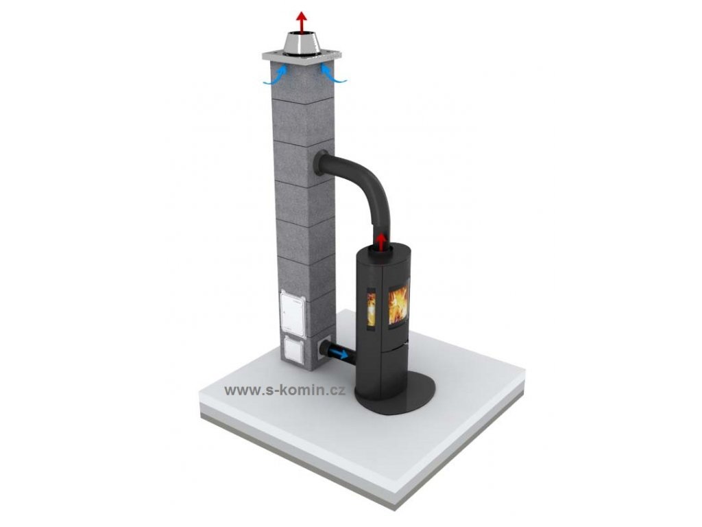 Třísložkový komínový systém s přívodem vzduchu mezi tvárnicí a izolovanou vložkou má průměr průduchu 16 cm s odbočkou 90°. Slouží k odvodu spalin ze spotřebičů na pevná, plynná (kromě kondenzačních) a kapalná paliva.